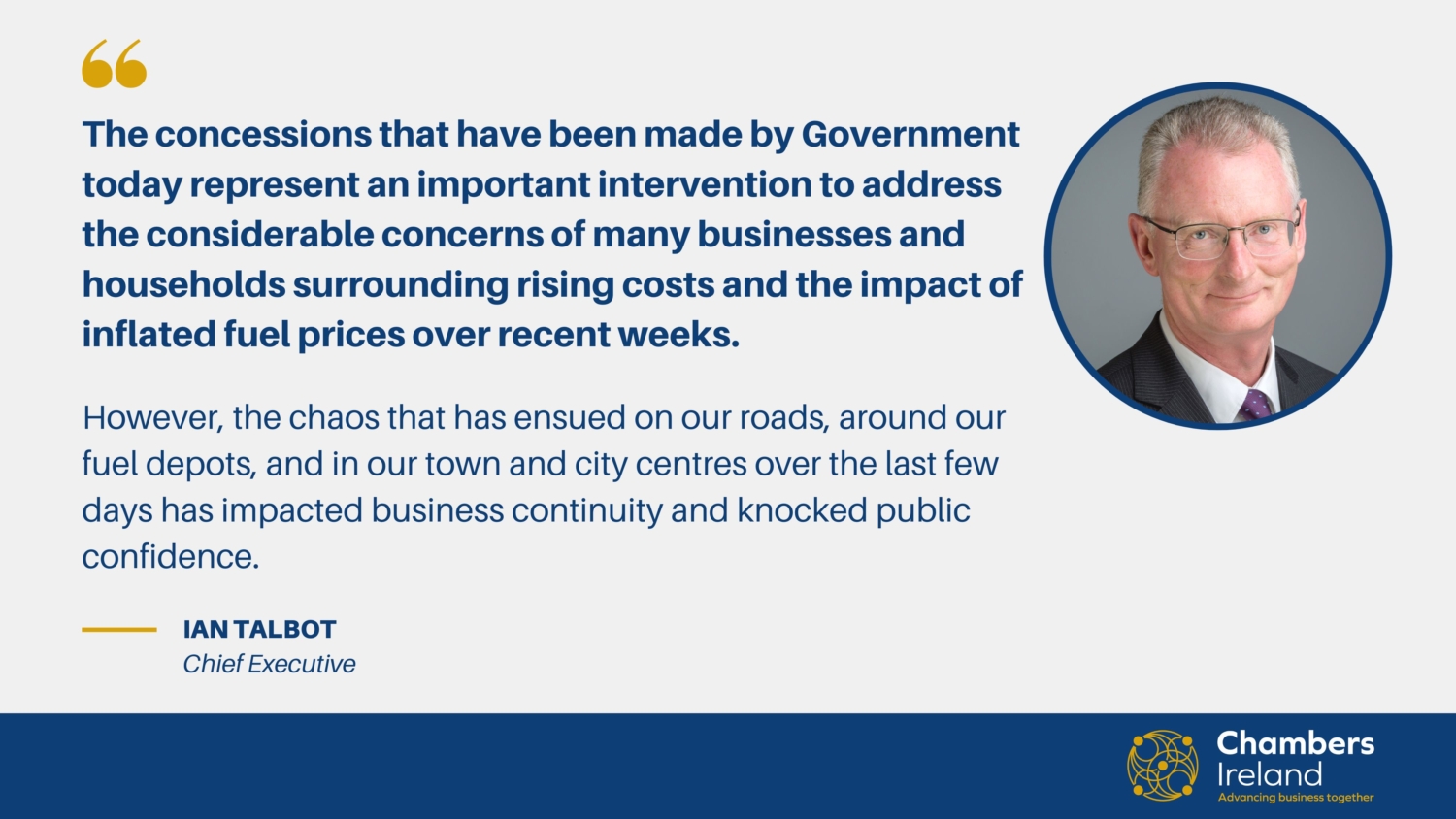 Chambers Ireland responds to Government action on fuel costs and urges protestors to restore order and end all nationwide blockades Chambers Ireland, the network that represents businesses across Ireland, has today welcomed the government’s interventions on fuel costs and urged protestors to end the disruption that has brought many parts of the country to a